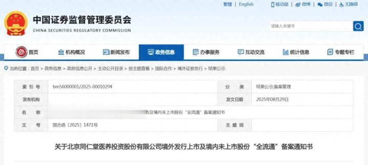中国证监会网站发布关于北京同仁堂医养投资股份有限公司境外发行上市及境内未上市股份“全流通”备案通知书。同仁堂医养将计划发行不超过136,930,500股境外上市普通股并在香港交易所上市。